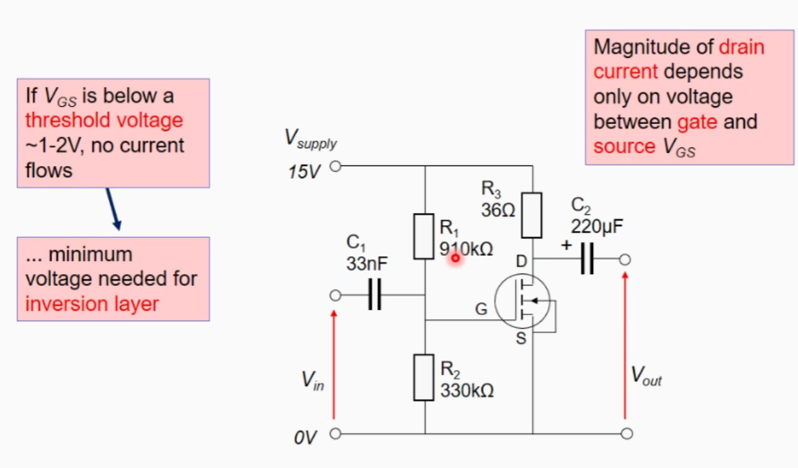 * Vgs is now the input signal and the quiesant voltage, this must be greater than the threshold voltage of around 1-2V to allow current to flow.