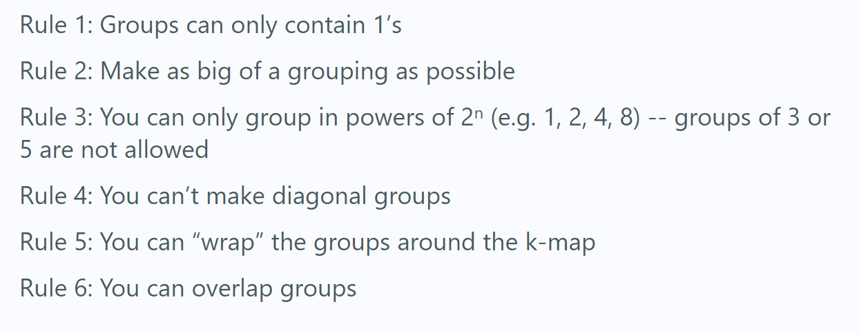 What are the 6 rules for Karnaugh Maps?