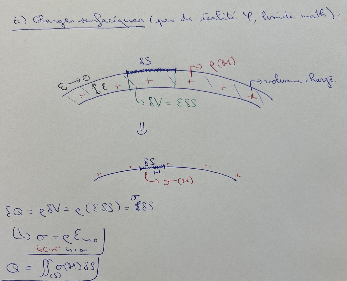 Définir la charge surfacique, l’exprimer en fonction de la charge volumique et donner la formule générale de la charge portée par une surface S