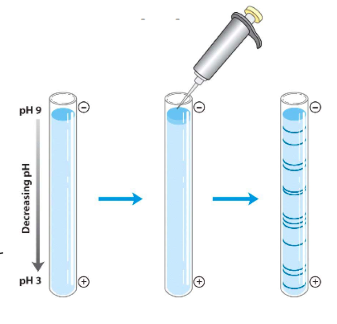 Jag tillsätter provet på en pH gradient, analyter kommer vandra till sin isoelektriska punkt. Alla proteiner har olik aisoelektrisk punkt vilket betyder att en separation är möjlig