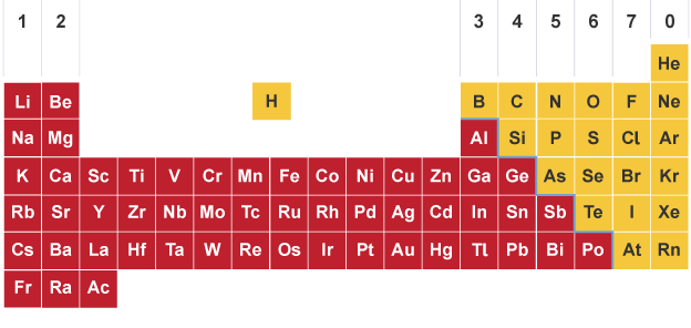 The elements in red are metals and the elements in yellow are non-metals
