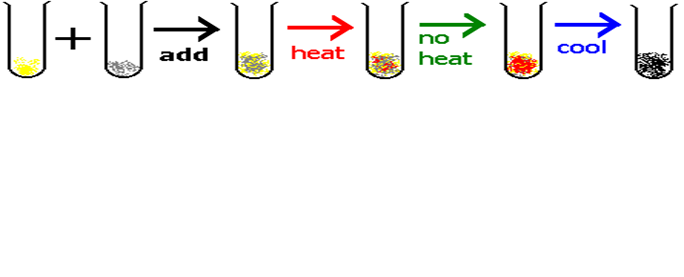 iron + sulfur –> iron sulfide