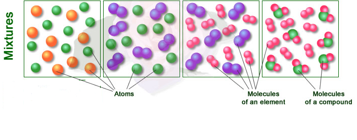Two particles of different elements that are not stuck together or could be a mixture of two different compounds or an element and a compound.