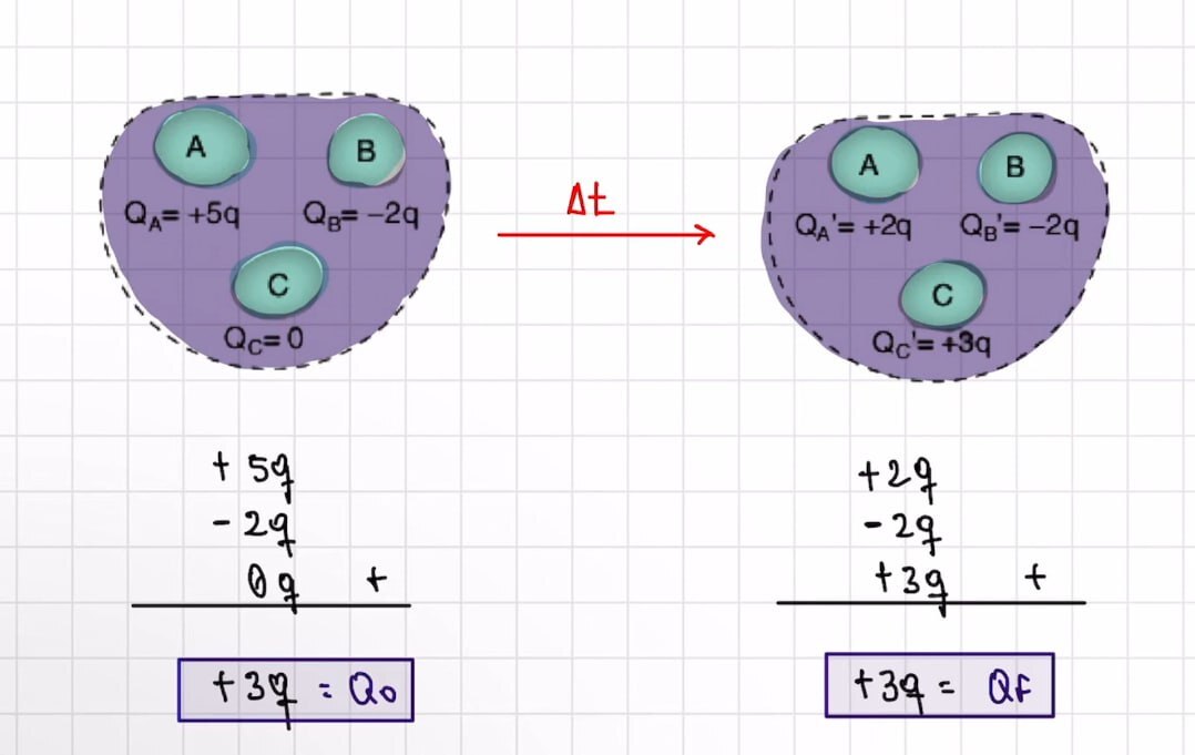 Em um sistema isolado(que troca cargas apenas com componentes do mesmo sistema), o somatório de antes e depois das cargas tem que ser igual.