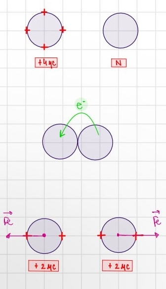 No caso abaixo, no qual temos esferas de mesmo raio, as cargas vão migrar para qual esfera e para onde apontará a força elétrica?