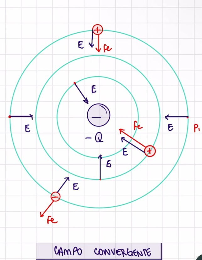 Em um campo elétrico de partícula central Q negativa, o vetor campo apontará para o centro do campo.
