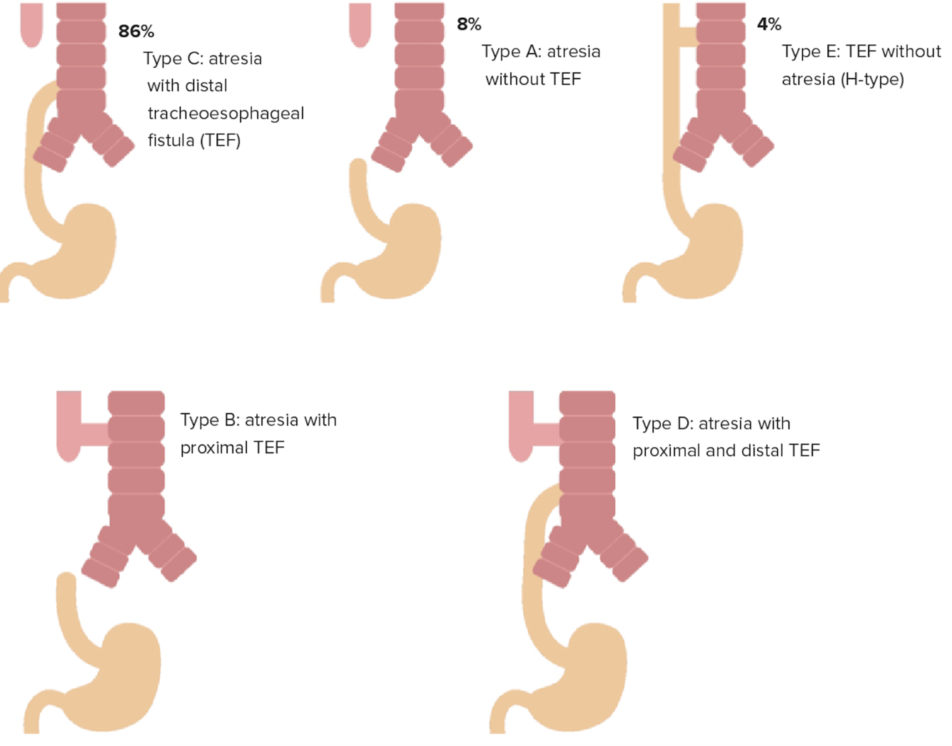 Often occurs in conjunction with a tracheal oesophageal fistula (88%)