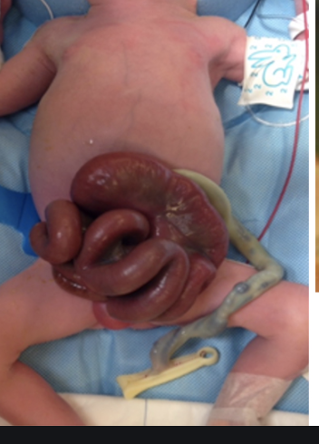Gastrochisis = bowels escape to the right of the umbilicus and there is no covering of the bowel (escape the G)