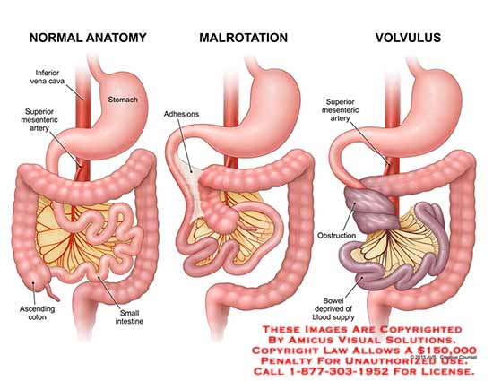 Surgical emergency as volvulus can lead to necrotic bowel if the blood supply from mesentery is occluded