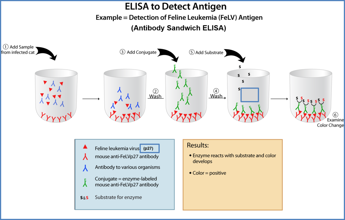 the antibody should be bound to the bottom of the well, antibodies and antigens will be added, the well should be washed, the antigen will bind to the antibody, conjugate (enzyme labeled) will be added, it should be washed again, substrate should be added, if positive the color will change