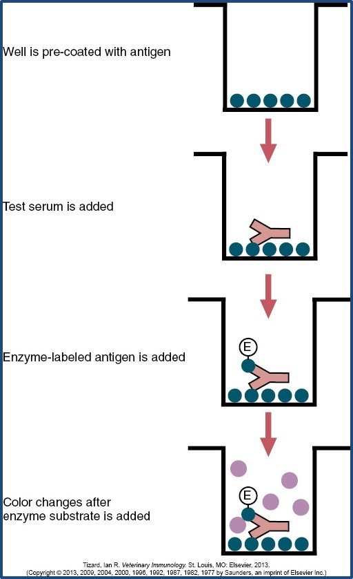 well is pre-coated with antigen, test serum is added (antibody), enzyme-labeled antigen is added, substrate is added and color should change