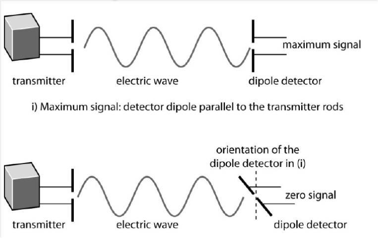Hertz discovered that the strength of the radio signal from the transmitter varies according to the orientation of the detector. Explain this effect and state the conclusion.