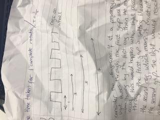 In Fizeau’s experiment, the reflected light could not be observed when the cog wheel with N teeth was rotating at f Hz. Calculate the time taken for a light pulse to travel from the cog wheel to the reflector and back at this frequency