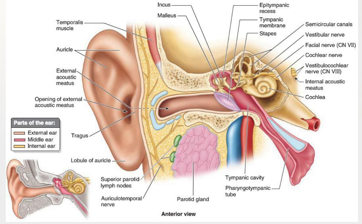 external: auricle (pinna), external acoustic meatus, tympanic membrane (external layer)