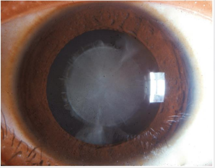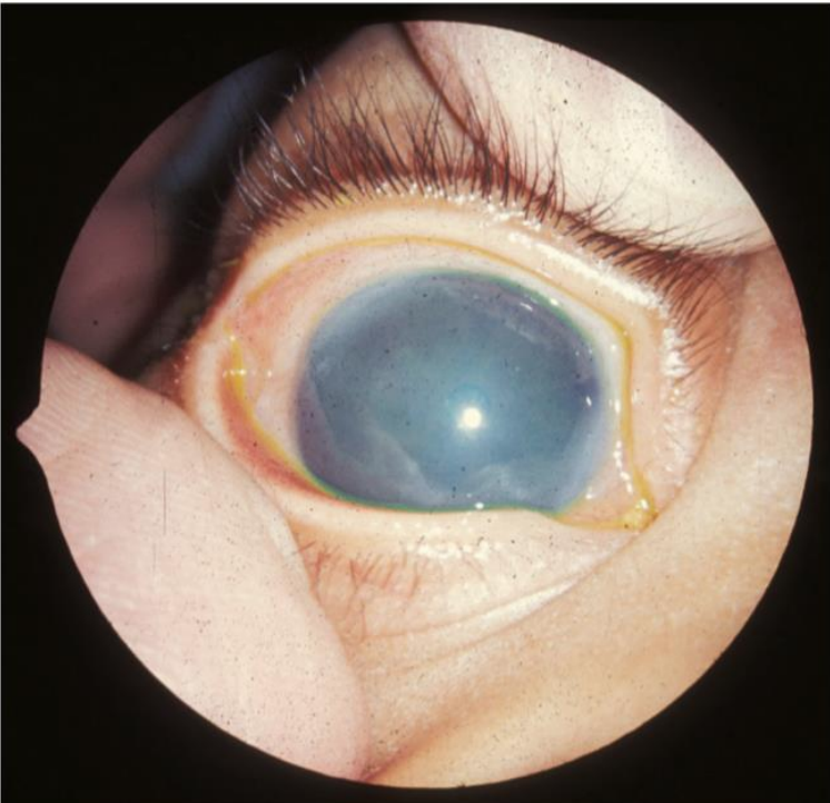 *whole eye looks hazy, not just lens like in cataracts*