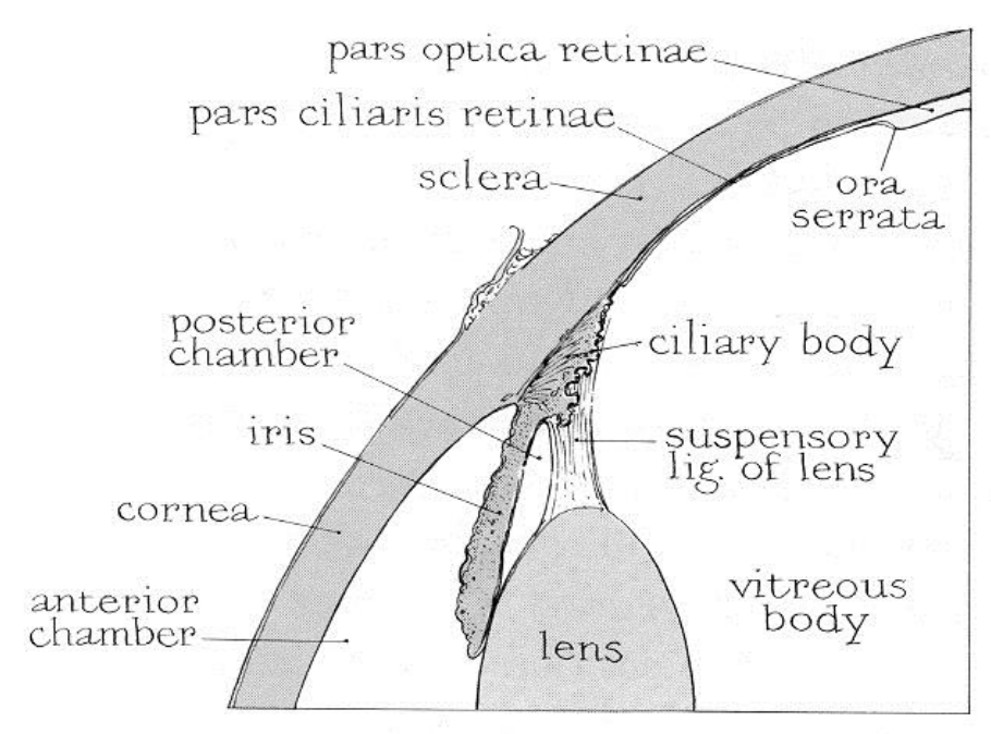Neuroectoderm, Surface ectoderm, mesoderm (blood vessels)/neural crest