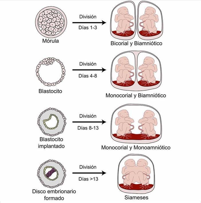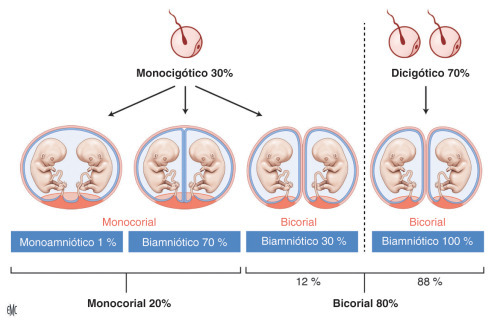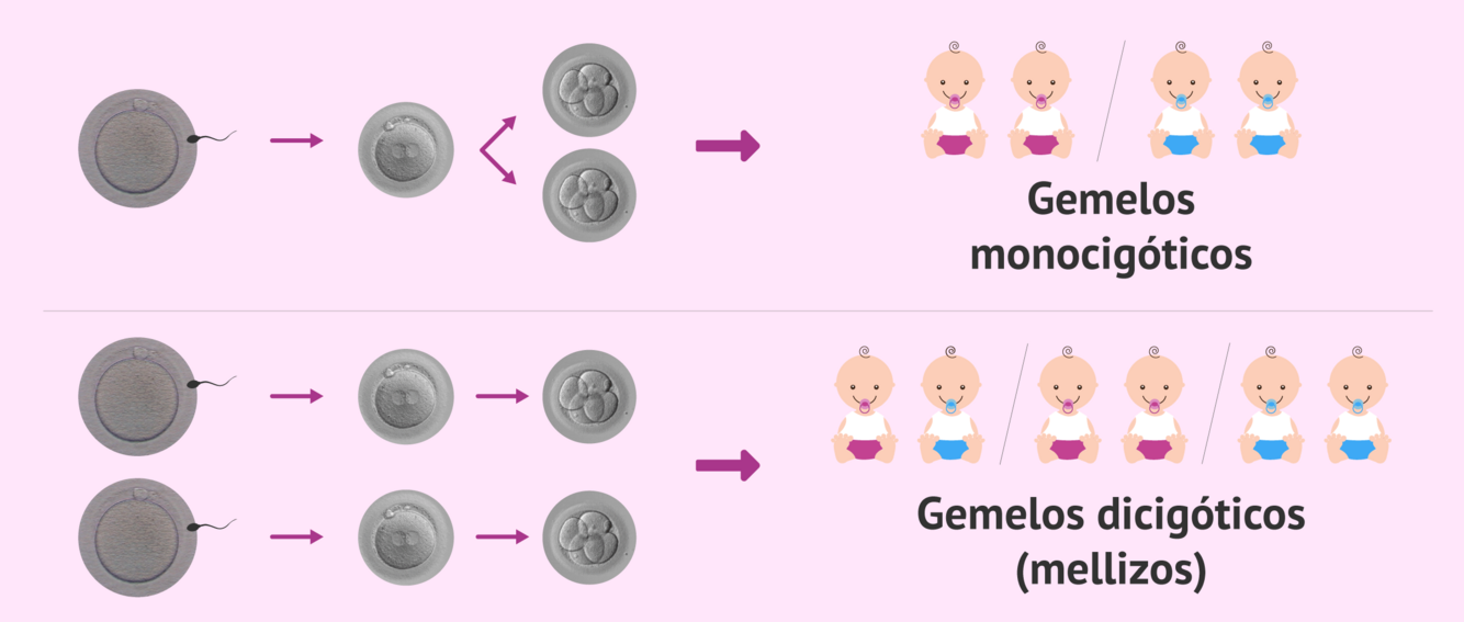 Gemelos fraternos de doble huevo o bicigóticos (75-80%), es decir, resultado de la fertilización de dos óvulos separados