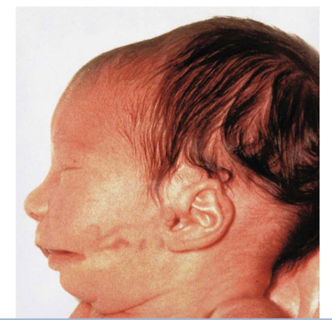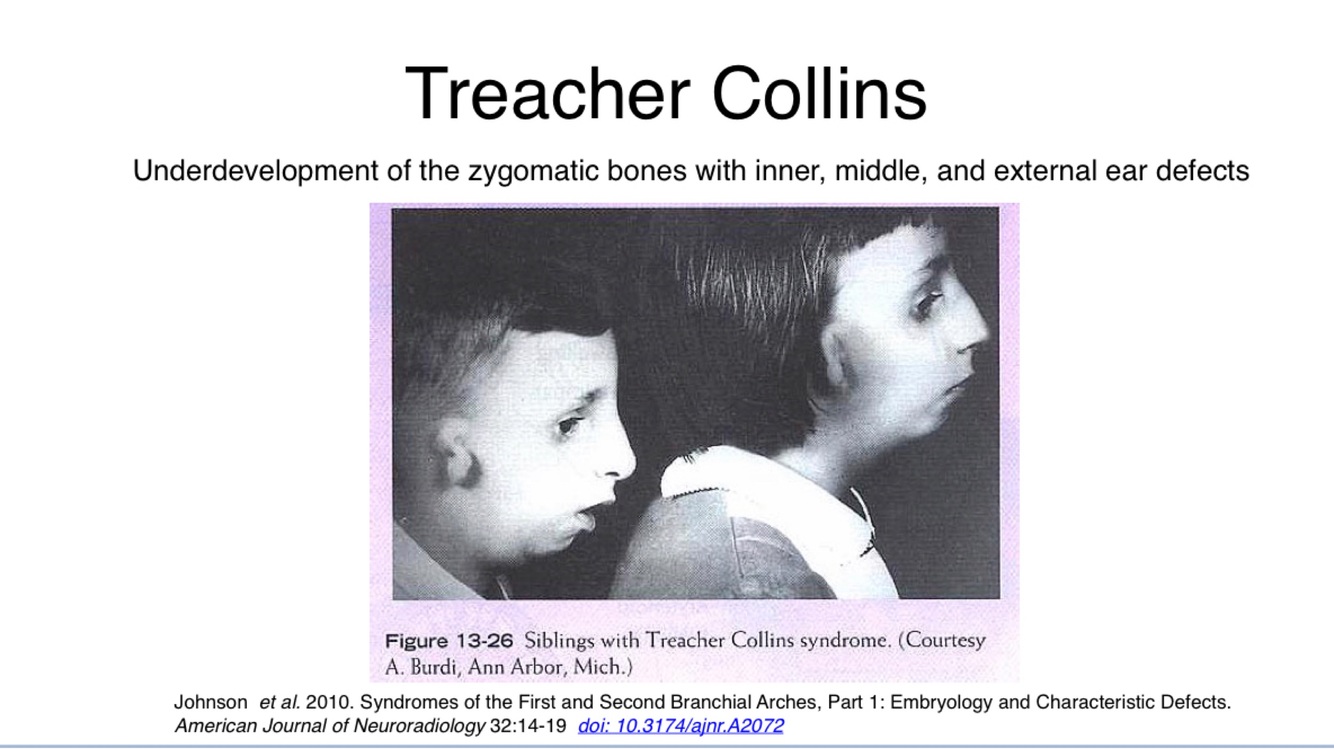 Teacher-Collins syndrome: underdevelopment of the zygomatic bones including abnormalities to the external middle and inner ear.