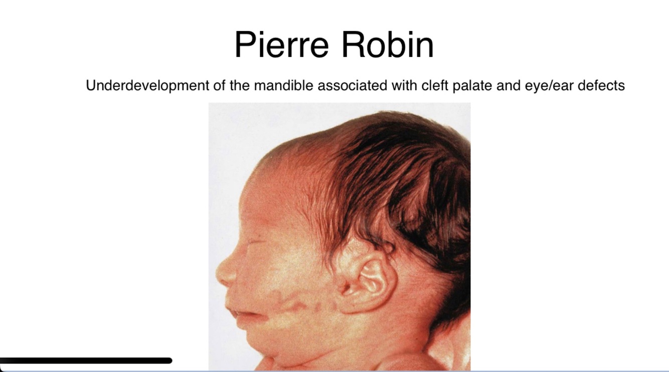 Pierre Robin sequence: general disorder including under development of the mandible, cleft palate, and defects of the eye and ear.