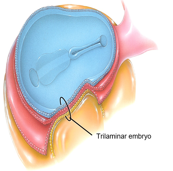 At this point of gastrulation (trilaminar embryo) the embryo starts to form three distinct layers. The blue which is the most outer part is the (ectoderm/mesoderm). The red which is the middle part is the (ectoderm/mesoderm). The last layer deep inside which is the orange layer is the (ectoderm/endoderm).