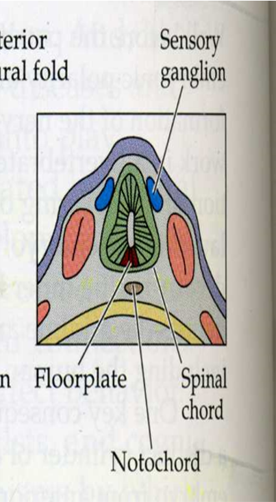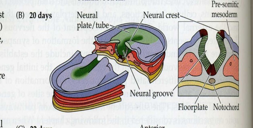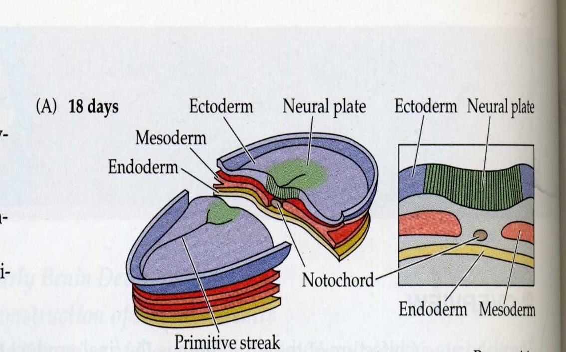 In human beings in about 18 days after fertilization of the egg, the ectoderm starts to fold up a little bit and you get the _____ plate. There is a structure that is embedded in the mesoderm called the ______ and this structure is critical to the organization of the human being, the animal, the CNS, and all the PNSystems that are coming into play.