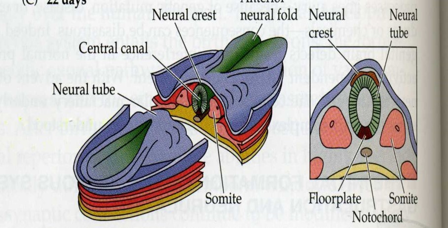 Three weeks (22 days) into the gestational period we have a slightly more well-developed structure and that center matrix (the green part) starts to form more of a tube-like structure. The somites, which sit side by side are coming off of the (ecotderm/mesoderm) and that is what is going to differentiate into the muscles.