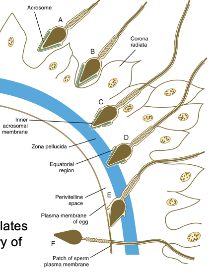 acrosome reaction is initiated around contact with zone pellucida and stimulates release of lytic enzymes that facilitate entry of the sperm head via membrane fusion