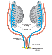 blue: Mesonephric duct / Wolffian duct, responsible for male development