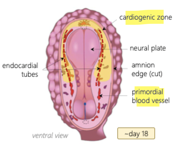 towards the head of the fetus and will give rise to the two primitive blood vessels known as the endocardial tubes