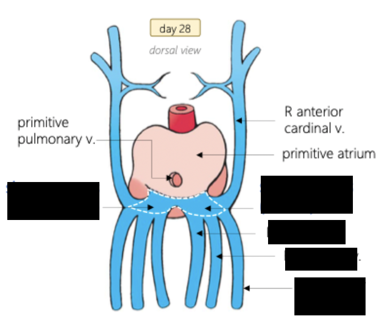 The whole left side will disappear and only the vitelline v will remain (becomes the IVC) as well as the anterior cardinal v. (become the L and R brachiocephalic vv. and SVC)