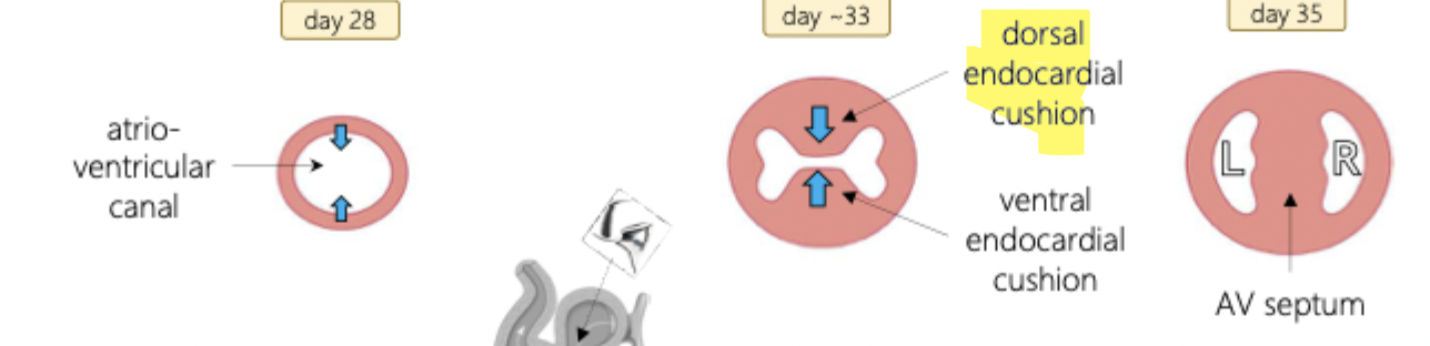 The atrio-ventricular canal will close in on itself (dorsally to ventrally) until there is formation of the AV septums