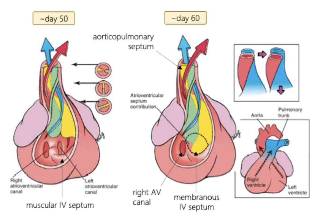 4) septation of outflow tract into aorta and pulmonary trunk