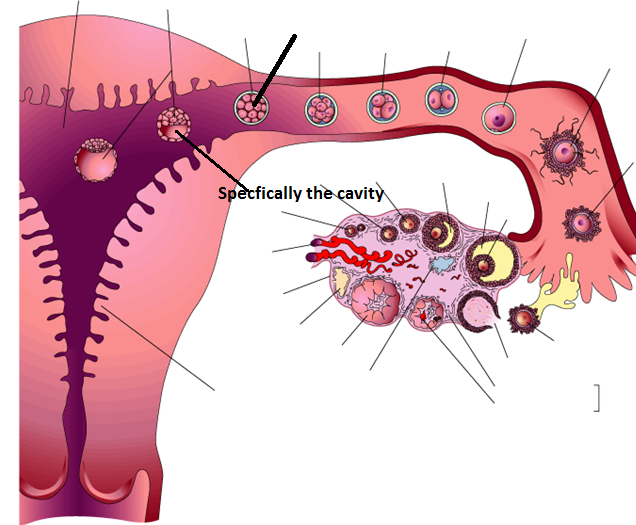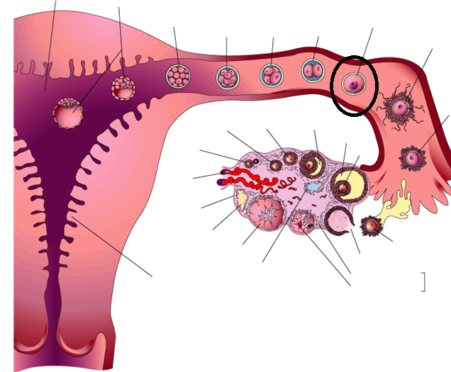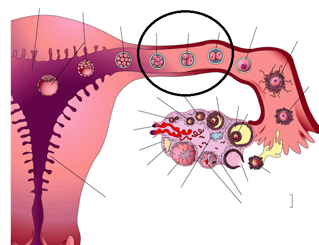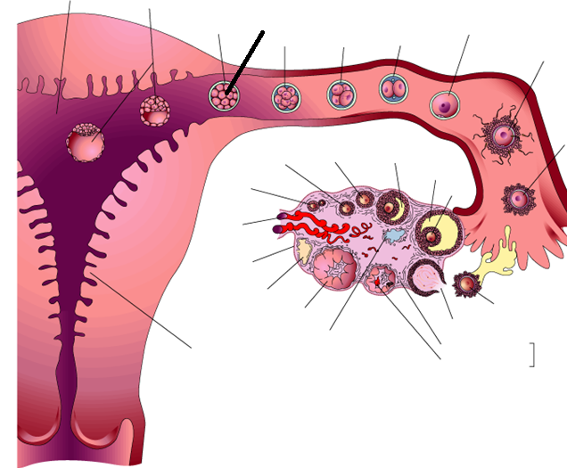 At 16 blastomeres (approx 4 days) zygote becomes morula. Named after mulberries. Continues to move toward uterus.