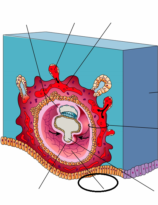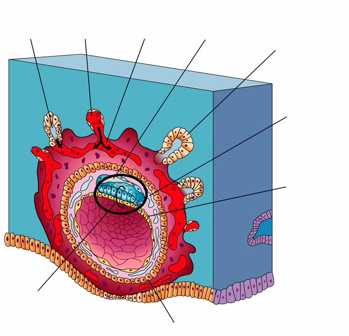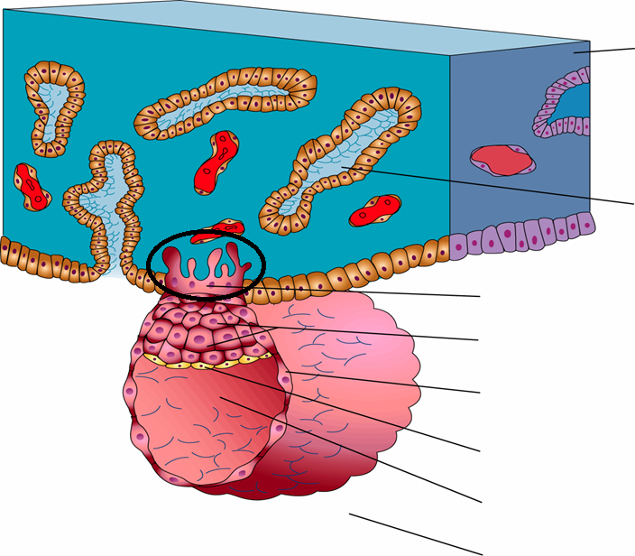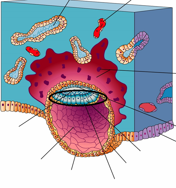 Outer layer of trophoblast. Means “without cells”. Undifferentiated, invades into uterine wall. Releases many enzymes that allows it to penetrated aggressively further/deeper into endometrium. Produces HCG: Human coreanic gonadotropin, + on pregnancy tests, important for maintain endometrium of uterus so not expelled