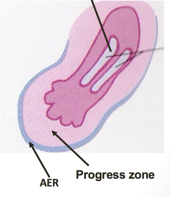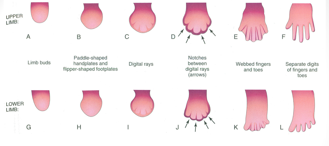 Firstly - the distal ends of the limb buds flatten into paddle-like hand plates and flipper-like foot plates