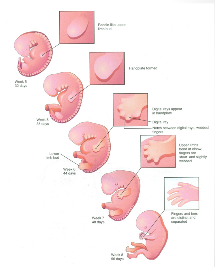 Secondly - by the end of 6th week, mesenchymal tissue in hand plates has condensed to form digital rays