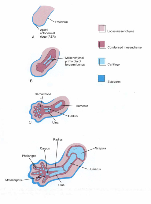Cartilaginous precursors of the limb bones develop by chondrification within the mesoderm in the 6th week