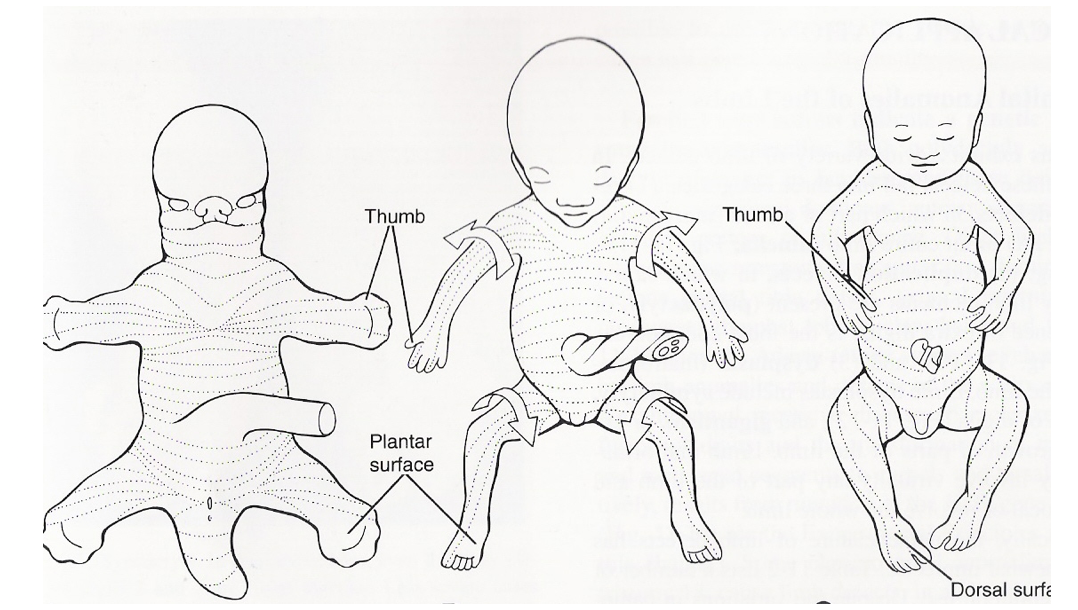 Lower limbs rotate 90o medially so that the extensors (Quads etc) are on the anterior surface