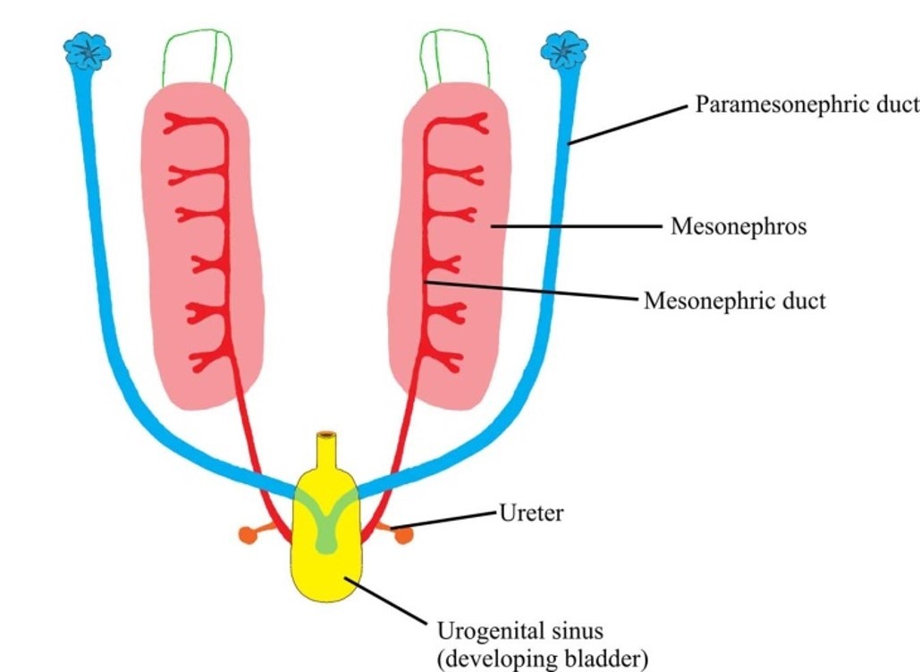 True or false: The paramesonephric duct crosses ventral (anteriorly) to the mesonephric duct