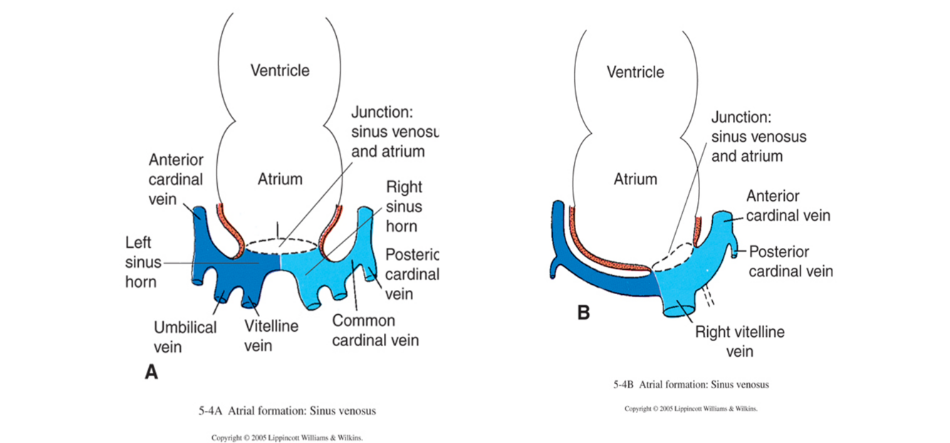 The left common cardinal vein merges with the right. The left sinus horn becomes the coronary sinus which terminates as the oblique vein of the left atrium. The right sinus horn expands into the atrium