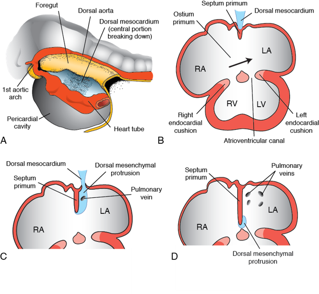 The septum premeum pulls the dorsal mesocardium down to septate the atria - mesoderm from the mesentery that connects the heart to the gut tube