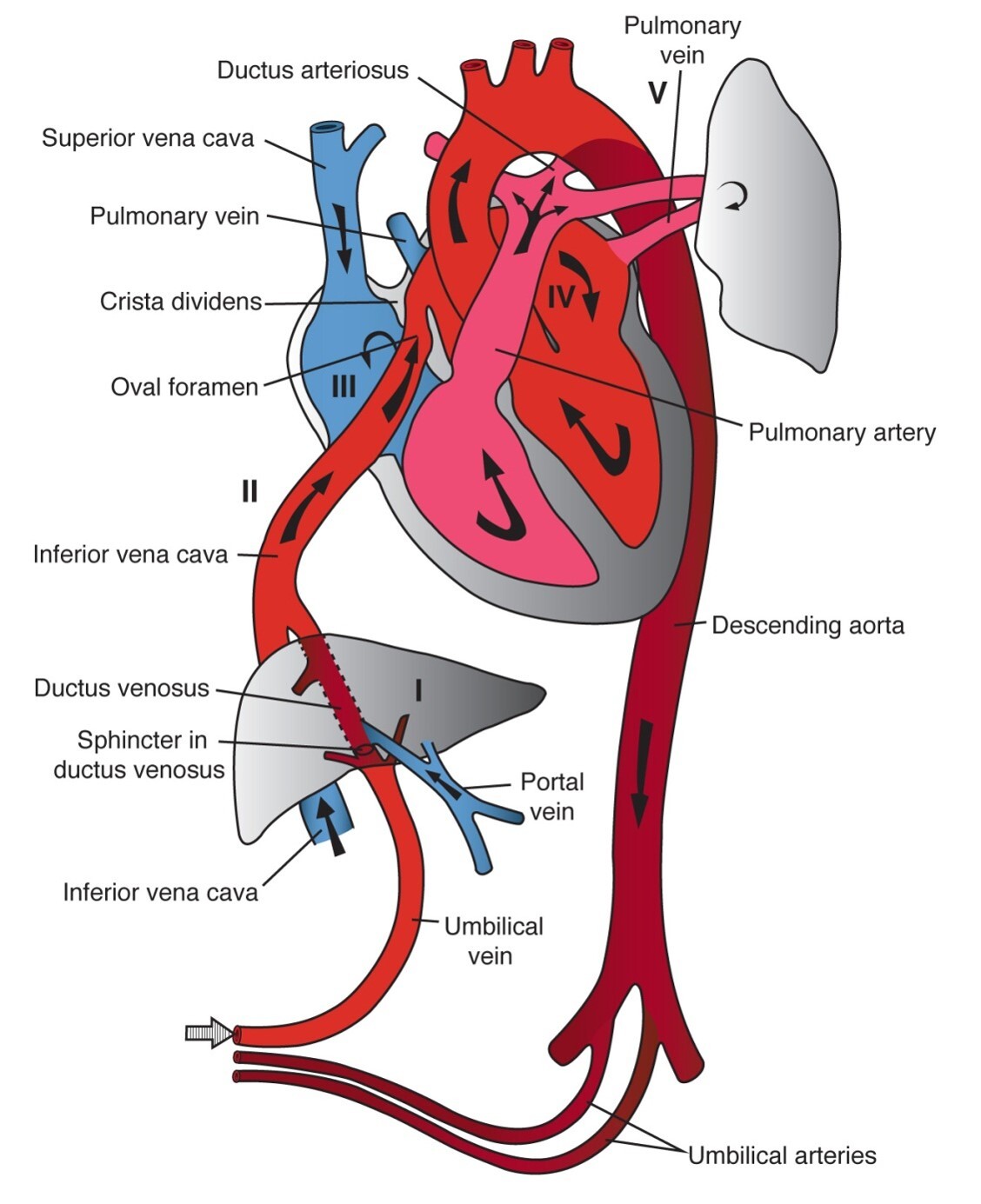 Placenta - Umbilical vein - inferior vena cava - oval foramen - left atrium - left ventricle - aorta