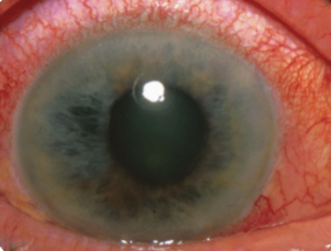 abrupt onset of severe eye pain / redness / blurry vision / headaches / nausea / halos around lights / fixed mid-dilated pupil / conjunctival redness / corneal edema