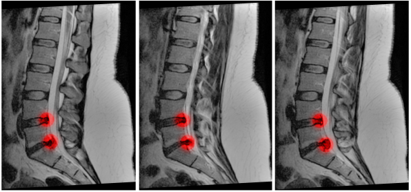 MOST COMMON: central disc prolapse (usually L4/5 OR L5/S1)