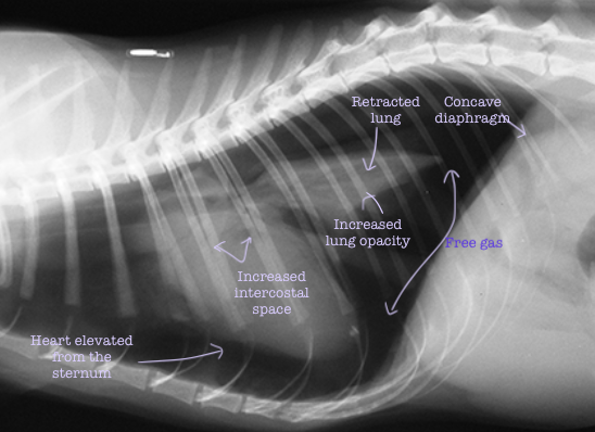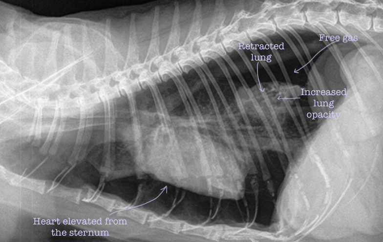 Heart elevated from the sternum Retraction of the lung lobes with free gas between the lung and the thoracic wall