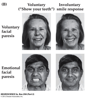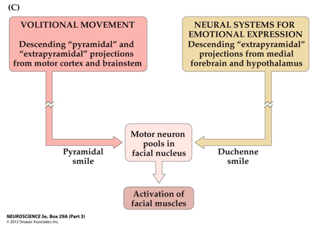 That there are two different pathways for the motor control to express emotions → one for the voluntary movement of facial muscles (generating only the (fake) smile) and one for the involuntary movement of facial muscles (generating a real smile). The latter involves the regulation of neural systems for emotional expression.