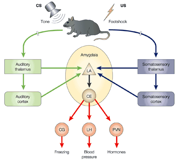 Auditory and somatosensory information is processed by the thalamus and cortex and then transmitted to the lateral amygdala. Here, the lateral amygdala interacts with the central nucleus of the amygdala. Next, the behavioral outputs (freezing, blood pressure, hormones) are mediated by the hypothalamus.