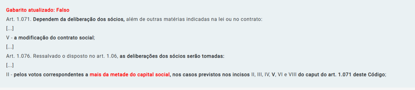 Para aprovação das deliberações, as sociedades limitadas exigem quóruns diferenciados, a depender da matéria a ser discutida. Acerca desse assunto, é correto afimar que indica uma matéria que exige, no mínimo, o quórum de três quartos do capital social para sua aprovação, a modificação do contrato social.