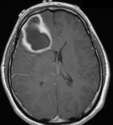 MRI brain showing ring-enhancing lesion in the right frontal lobe with surrounding oedema