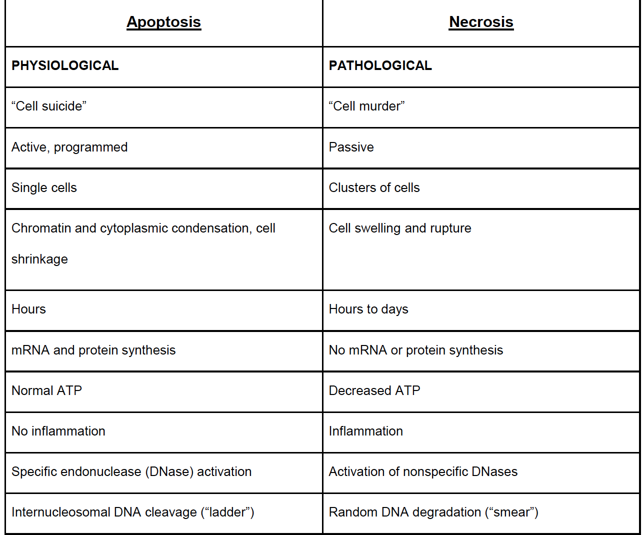 draw out the table of differences between apoptosis and necrosis. 11 differences.
